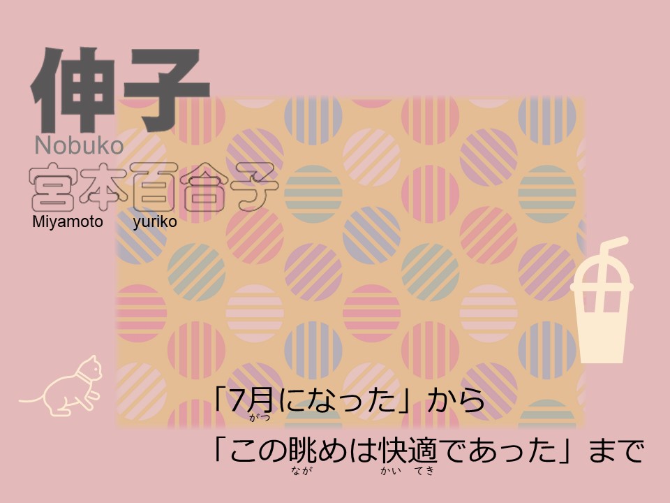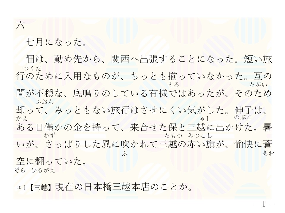 ▶長編小説、伸子(のぶこ、19歳、20歳くらいの女の子)が主人公。