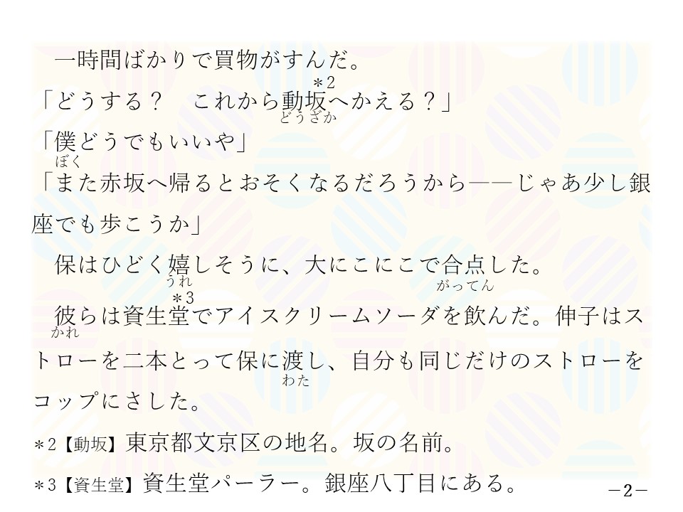 2)また赤坂へ帰るとおそくなるだろうから―じゃあ少し銀座でも歩こうか