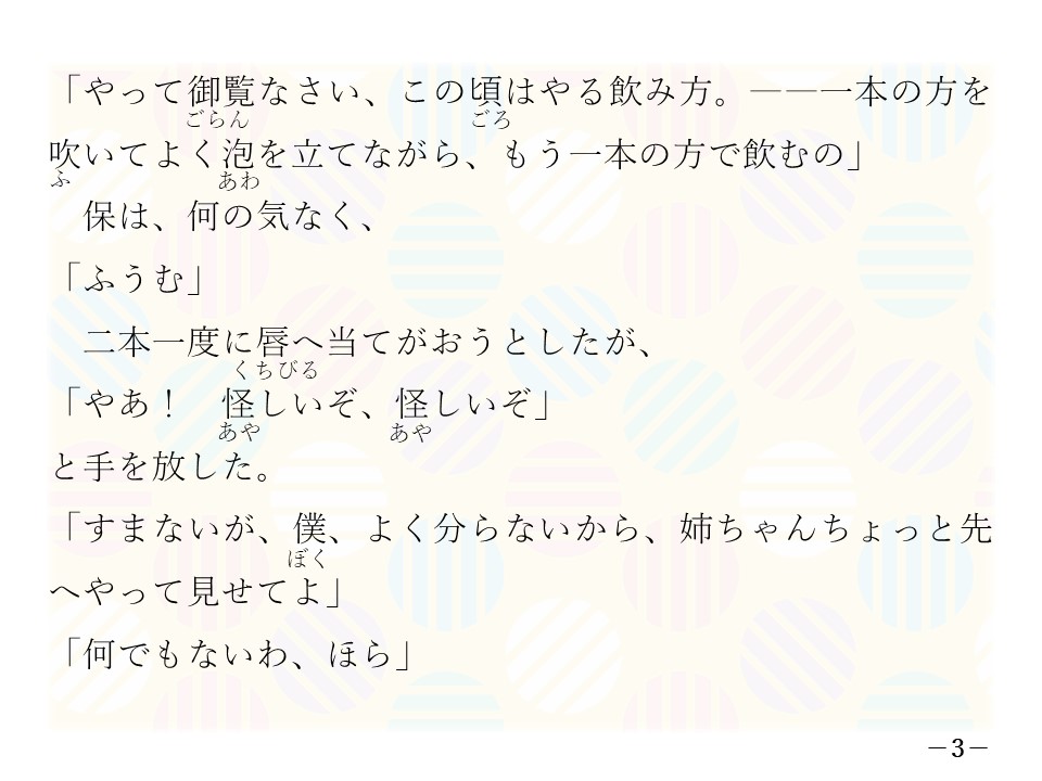 3)保は、何の気なく、「ふうむ」 二本一度に唇へ当てがおうとしたが、「やあ! 怪しいぞ、怪しいぞ」と手を放した。