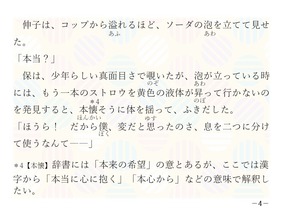 4問目 ①伸子はどんな飲み方で飲めと保に言いましたか。②保はそれをどう思いましたか。