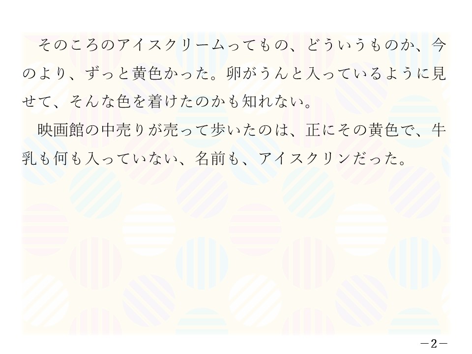 2)そのころのアイスクリームってもの、どういうものか、今のより、ずっと黄色かった。卵がうんと入っているように見せて、そんな色を着けたのかも知れない