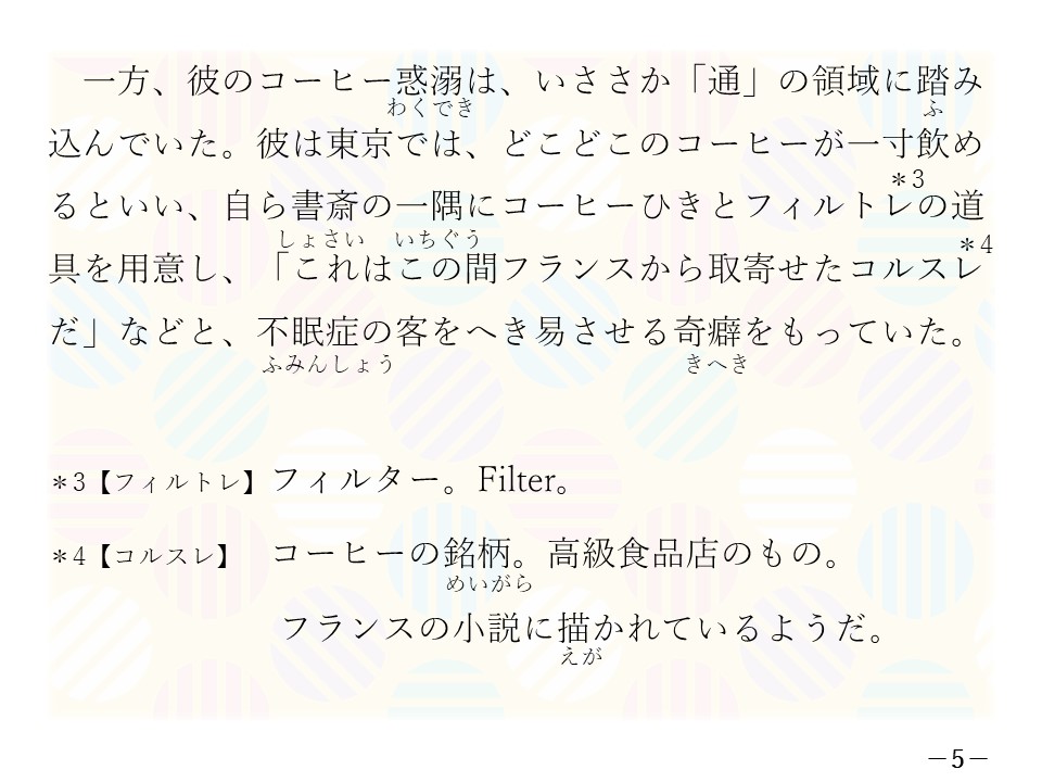 書斎にコーヒー道具を持っていて、わざわざフランスから高級コーヒー(コルスレ)を取り寄せた。(p.5)