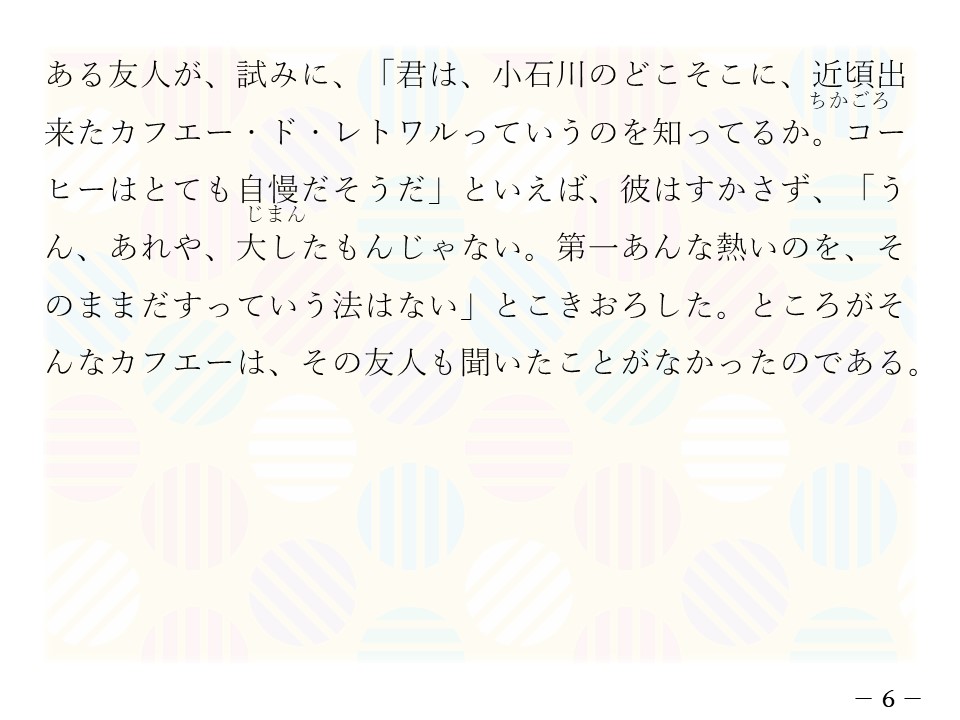 岸田國士さんの読み物はテンポがあって、面白いですね。ここで言われている「コーヒーをたしなむこと」をたしなむ人というのは、どの世界・どの時代にも一定数いると思うのですが、皆さんはどう思いますか??