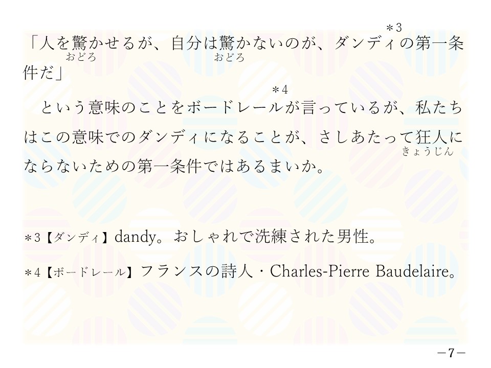 4)驚嘆すべきことが、応接にいとまのないくらい、目まぐるしく表情を変えて、あわただしいテンポで私たちを襲っている昨日今日、いちいち莫迦正直に驚いていた日には、明日の神経がはや覚束ないのである。