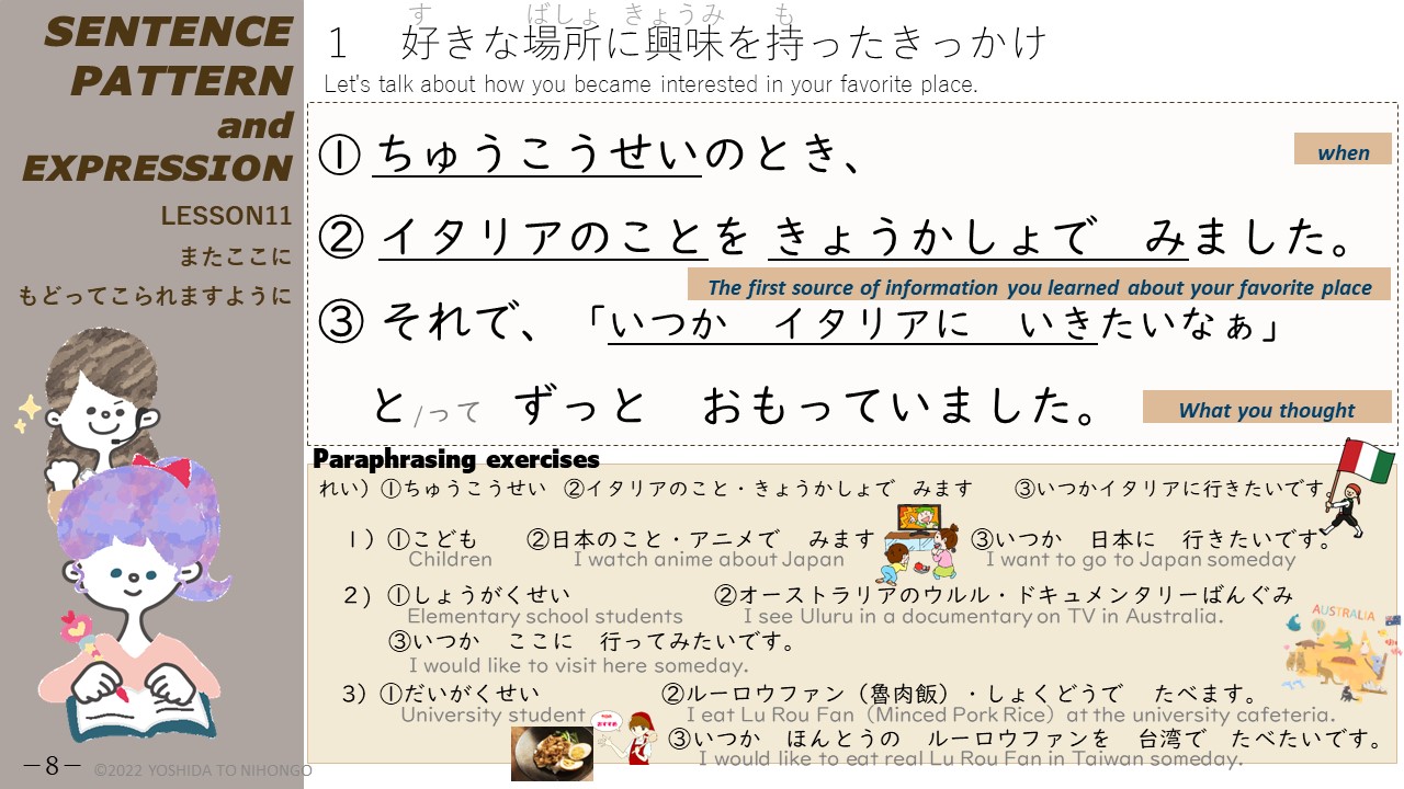 1)①こどものとき、② にほんのことを アニメで みました。③ それで、「いつか にほんに いきたいなぁ」と ずっと おもっていました。