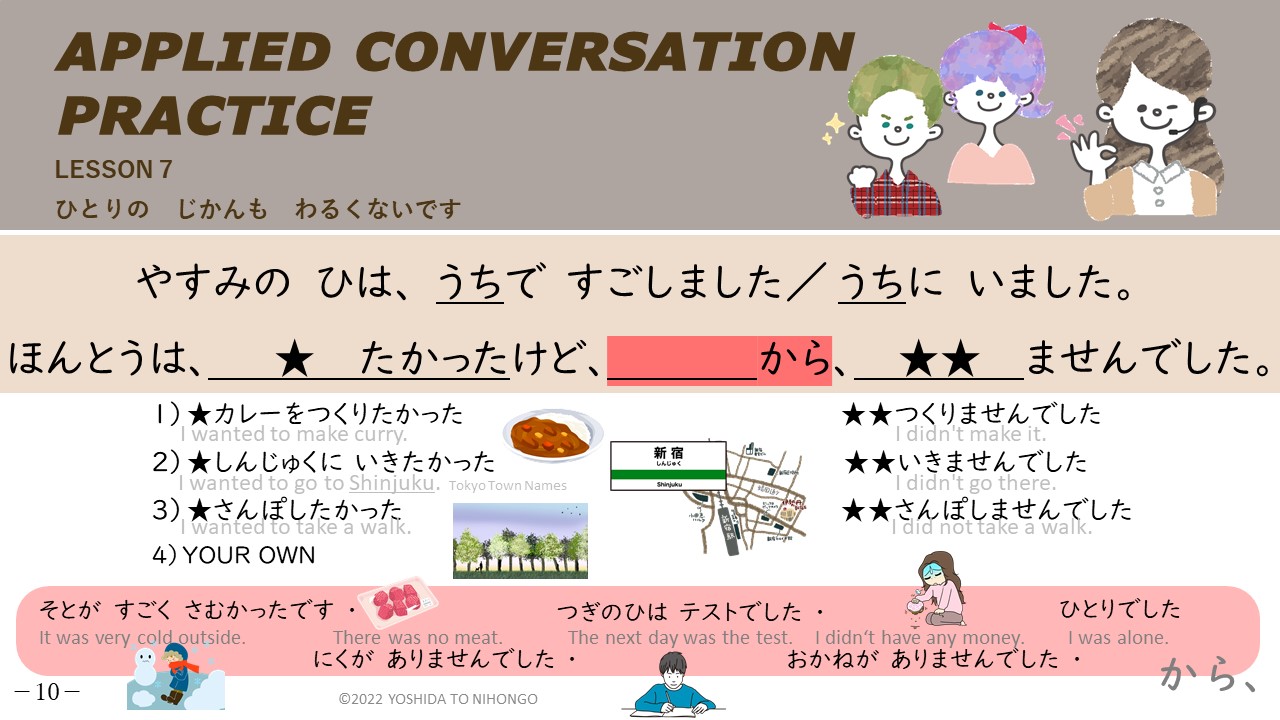バックミラーさんの ぶん)やすみのひは うちに いました。ほんとうは ゆうえんち(amusement park)に いきたかったけど、あいていませんでしたから、いきませんでした。(I really wanted to go to the amusement park, but it wasn’t open, so I didn’t go.)